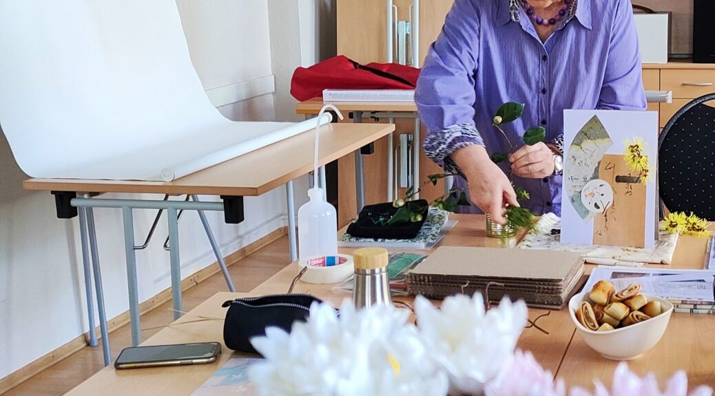 Edelgard Herwald stellt Shikishi aus Japan zur Verfügung zum Gestalten für ein Arrangement. Unter der Federführung von Ulrike Linhorst bringen die Mitglieder vorbereitete frische und getrocknete Materialien mit. Jeder belegt sorgfältig seine Unterlage.