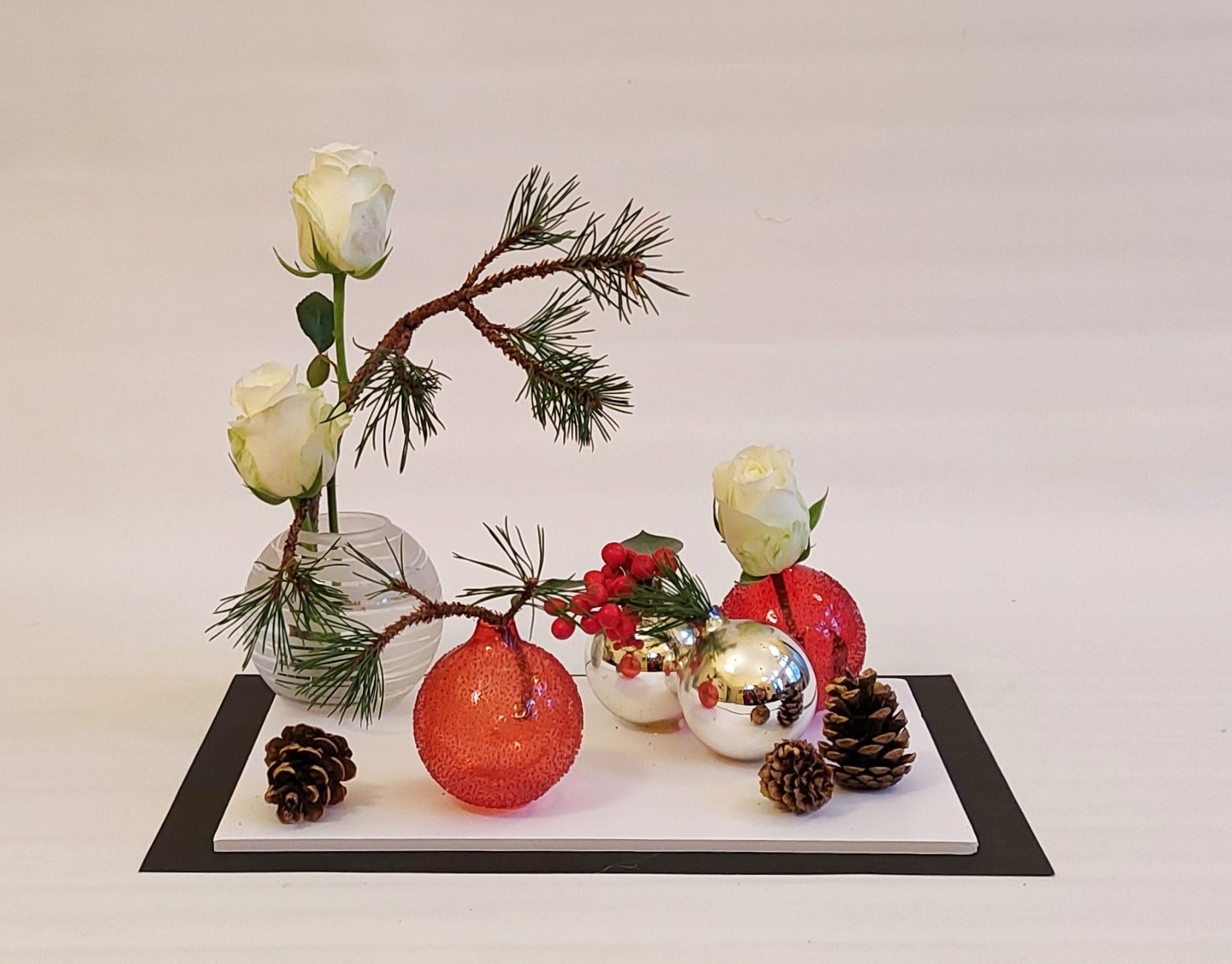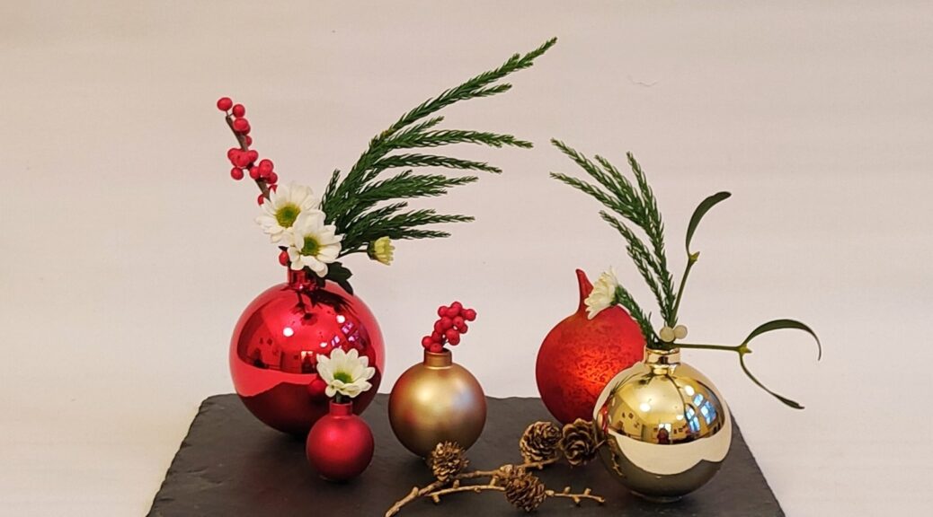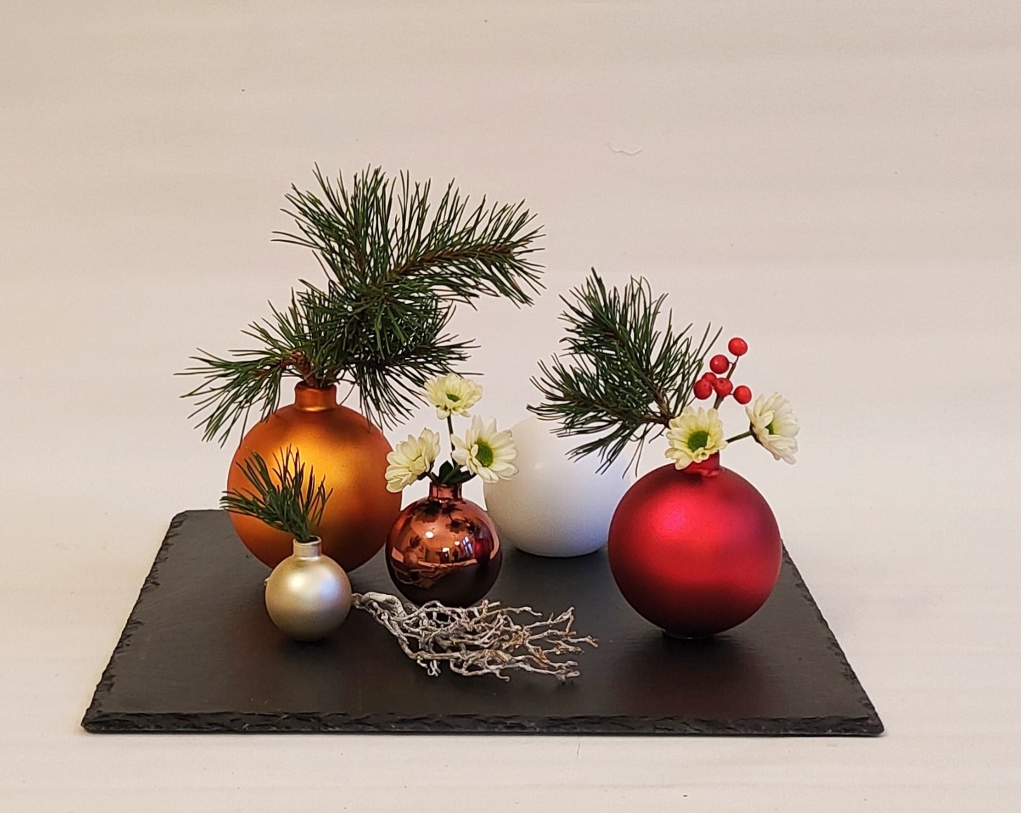 Ulrike Kuppels hält einen Workshop für Mini Arrangements mit Gefäß(en) aus Weihnachtskugeln. Farbe, Anzahl, Größe und sonstiges Zubehör können frei gewählt werden.